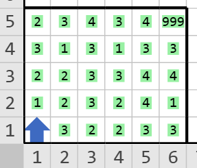 En este caso la fila 5 es la que mas personas tiene (\(2 + 3 + 4 + 3 +4 + 999 = 1015\)) por eso Karel tiene que dejar 1015 zumbadores en la casilla \((1, 1)\)