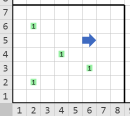 El mundo de Karel representa la hoja del ejercicio. Las paredes que rodean el mundo son las que delimitan el rectángulo. Las casillas con montones de \(1\) zumbador representan los cuadros que Karel dibujó en negro.