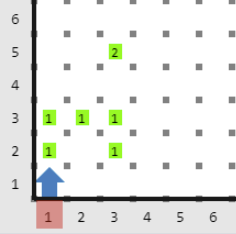 El mundo de Karel representa un juego de _Derrumbe_. Karel representa al jugador y empieza en la casilla \((1, 1)\). Las piedras se representan por montones de \(1\) zumbador y la moneda se representa por un montón de \(2\) zumbadores.