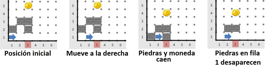 - Todas las piedras y la _moneda_ caen una casilla hacia abajo.